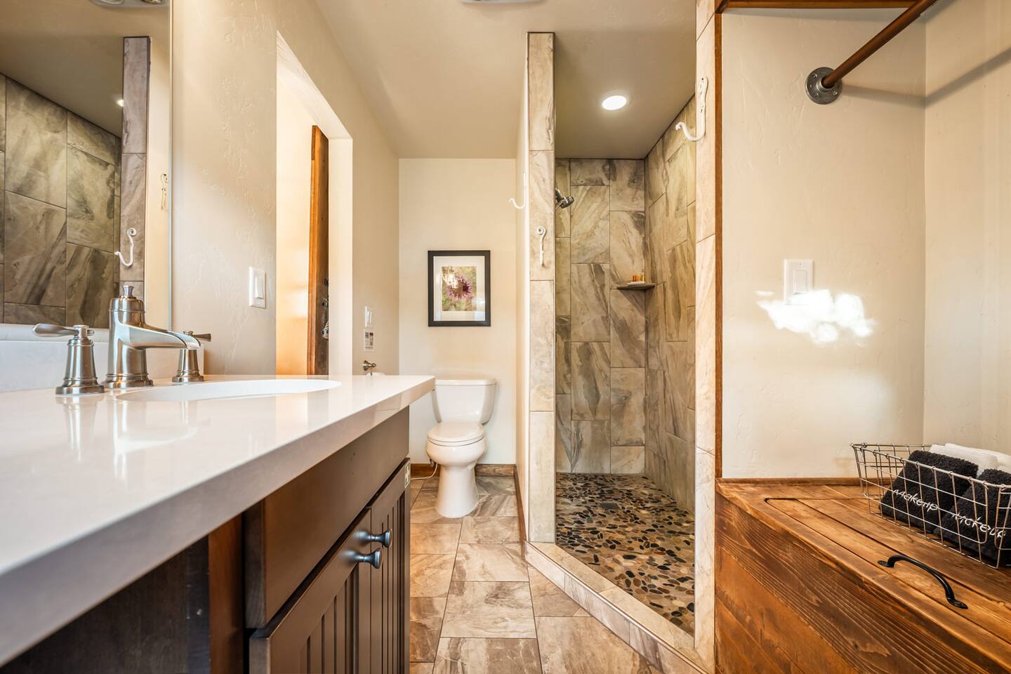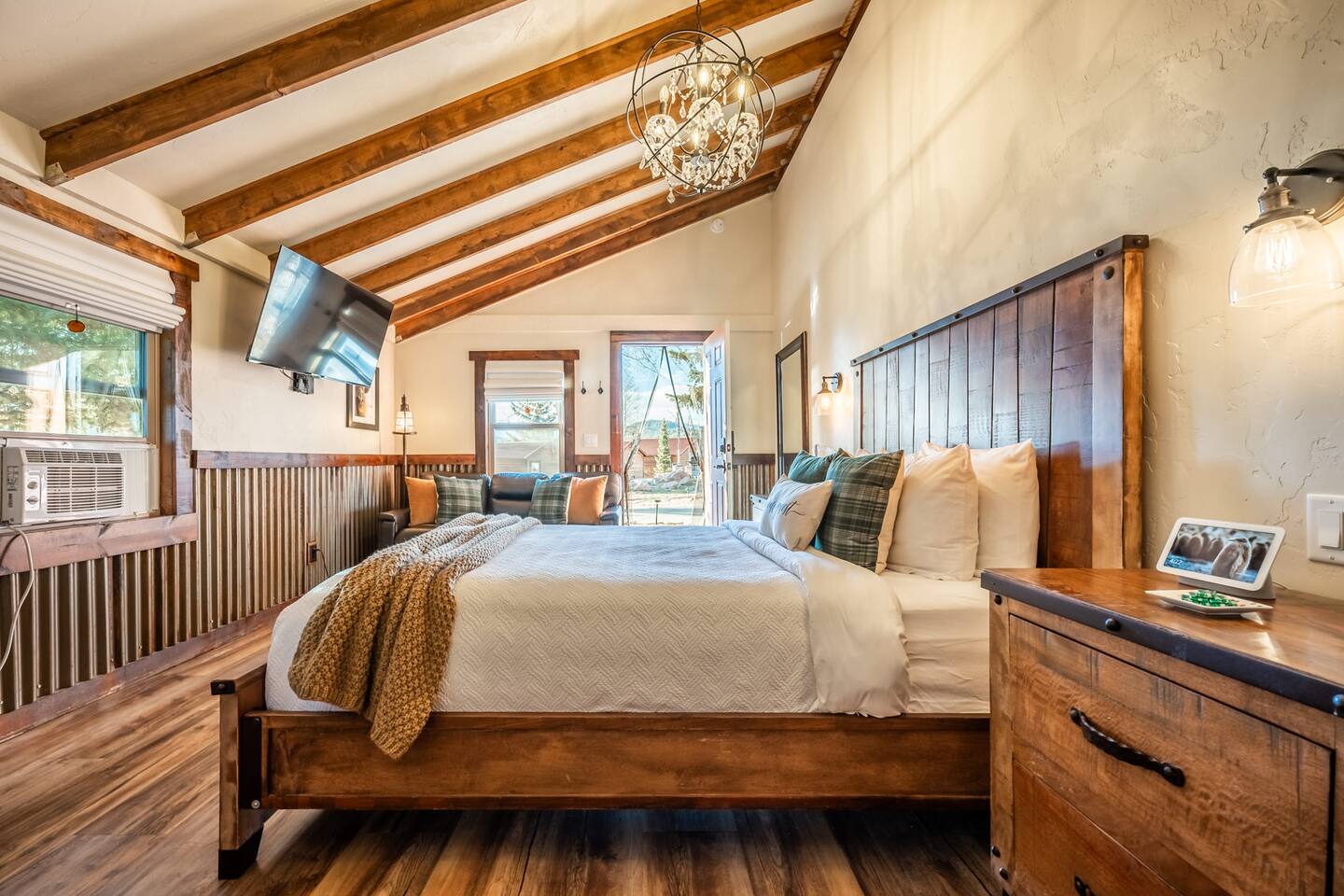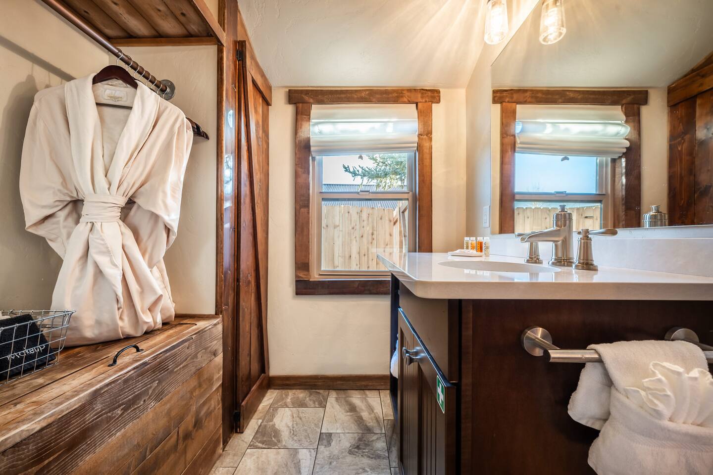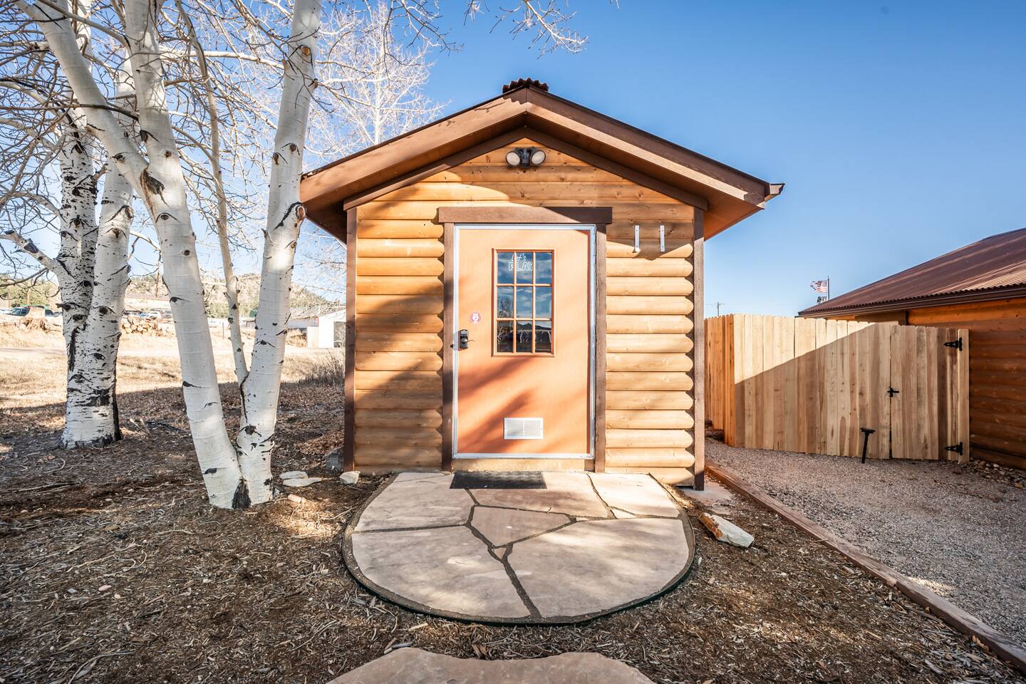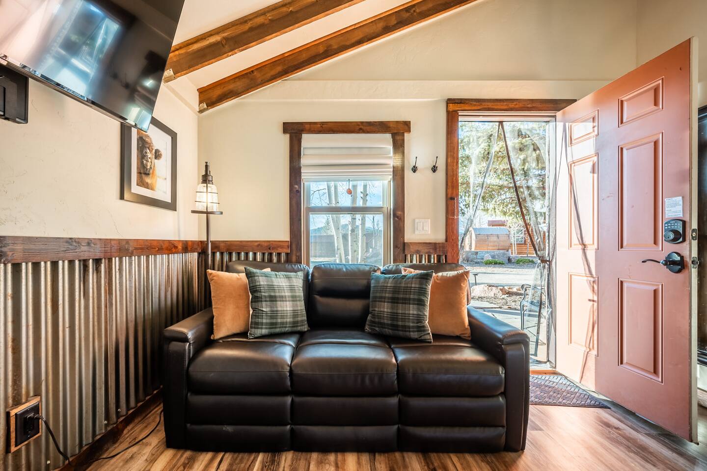 You will have exclusive access and private use of the full interior of your cabin. This cabin offers a rare feature that sets it apart from some of the other cabins—your very own fully fenced-in private backyard. Unlike the shared community patio available to all guests, this secluded outdoor space is reserved exclusively for your cabin. Outfitted with Adirondack chairs and a modern gas fire pit, the backyard is the perfect spot for cozy conversations, roasting marshmallows, or stargazing in the crisp mountain air. All guests at Mountain River Lodge have exclusive access to a fully stocked Community Game Hub, located just steps from the cabins. Inside, you'll find everything from cornhole, giant Connect 4, ladder toss, and pickleball paddles, to basketballs, footballs, tennis rackets, and more. The space is designed with play in mind—whether you're planning a full day of games with family or just want to grab some gear and head outside, it's all here for you. And if you're looking to break a sweat or challenge a friend to a match, there are tennis courts conveniently located right across the street from the property. Bring your rackets (or borrow ours) and enjoy a match with stunning mountain views as your backdrop. Also, enjoy shared access to the central brick patio and amenities including wood-burning fireplace, outdoor lounge and dining furniture, two propane fire pits, two commercial grills, and barrel wood sauna. Guests from all cabins are welcome to use this space, so please ensure your behavior and noise volume is appropriate and considerate of others, especially during quiet hours of 10pm to 8am. You will have one dedicated parking space directly next to your cabin. A dirt parking lot at the west end of the property can be used for additional or oversized vehicles, RVs, boats/trailers, ATVs, as well as any vehicles with a tendency or potential to leak automotive fluids. Please park wisely and be considerate of others sharing this space.