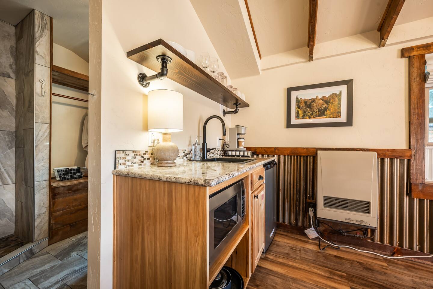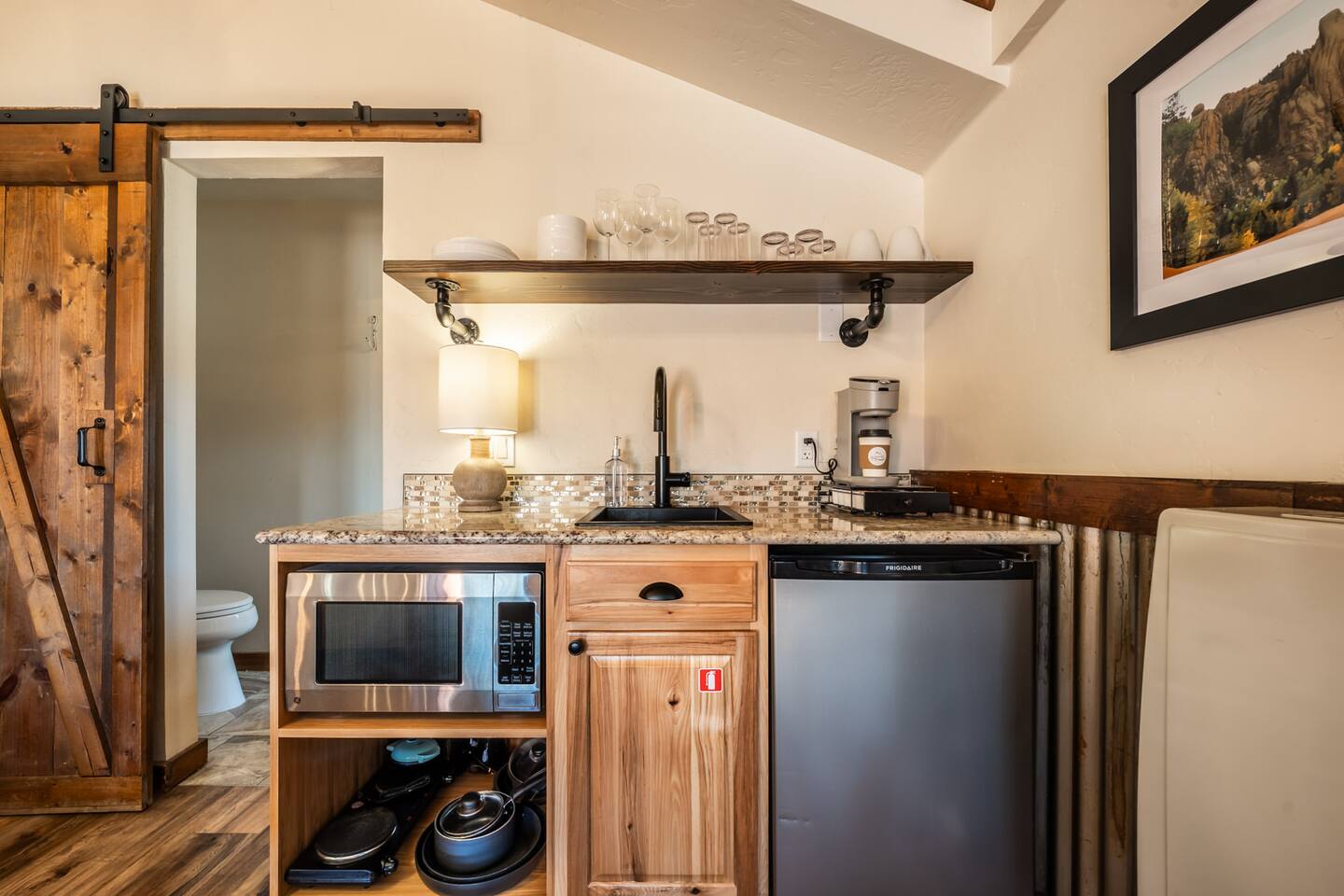 Escape to the luxurious Mountain River Lodge & Cabins in the stunning Colorado Rockies! Get ready for an unforgettable adventure surrounded by breathtaking nature. Your home away from home is just a short drive away from renowned fishing and boating spots, including the famous Gold Medal trout stream, "The Dream Stream," and Eleven Mile State Park . Our charming cabins offer all the amenities you need for a five-star getaway, from a fully stocked kitchenette and bathroom packed with all the essentials to a cozy bed and living area perfect for relaxation after a day of adventure. Embrace the warmth and charm of our retreat and make memories that will last a lifetime. ✼ Fly Fishing & Boating - Cast Your Line! ✼ Mountain River Lodge & Cabins boasts an unbeatable location surrounded by Gold Medal Colorado fishing waters, including the Dream Stream, South Platte River, and nearby Eleven Mile, Spinney, Tarryall, and Antero Reservoirs - all just a short drive away! As the only luxury lodge near three Gold Medal River sections in Lake George, we offer trophy fishing opportunities in this world-renowned fly fishing territory. Catch prize cutthroats, browns, rainbows, northern pikes, and kokanee salmon in our area rivers and reservoirs. Whether you're a seasoned angler or a novice, our lodge & cabins ensure an exceptional experience to support your fishing efforts. Each cabin is equipped with wader hooks on the outside and most cabins have fly rod holders inside, catering to our angler guests. Additionally, Mountain River Lodge is the perfect summer destination for boat enthusiasts. What could be better than cruising on a refreshing mountain lake during a scorching summer day? At Eleven Mile Marina, you can rent pontoons, boats, kayaks, canoes, and fishing equipment, as well as book guided tours. Whether you’re looking to fish, belly boat, canoe, kayak, windsurf, or motorboat, Eleven Mile State Park or the Gold Medal Rivers nearby have you covered! ✼ Easy Entry into Your Home Away From Home ✼ No need to worry about keys or limited check-in times upon your arrival. With our keyless entry system, you will be relaxing in your cabin in no time. Just punch in the code we'll send you and voila, you're in! The welcoming front porch holds a beautiful wrought-iron bench, perfect for enjoying the refreshing mountain air. Conveniently placed fisherman's wader hooks near the door make it easy to hang your gear after a successful day at one of our many award-winning fishing spots nearby. ✼ Find Comfort in the Living Area ✼ Get ready to relax on a cozy leather sofa. A 43-inch LG Smart TV with apps brings you a variety of streaming possibilities. We're also hooking you up with DirectTV for the live-channel lovers, So go ahead, kick back, and indulge in your favorite shows or movies after an action-packed day. Now, we should warn you—sometimes our "Rocky Mountain WiFi" can be a little shaky, inviting you to pause and enjoy the serenity of our remote surroundings. We've even thrown in some classic board and card games for whenever you're craving a dose of nostalgic fun! For groups of 3 or 4, the sofa transforms into a queen-size bed, so nobody has to sacrifice comfort. We've got you covered with fresh sheets, bedding, and pillows stashed away in a snazzy linen bag right inside the sofa. Need a little more light? We've got a stylish floor lamp just waiting in the corner. The wonderful gas-powered wall heater will keep you toasty during your stay. And not to worry, if you ever need an extra blast of warmth to combat any lingering chill, feel free to adjust the temperature to your heart's content. For those sunny days, we've provided a stand-up fan that's super easy to adjust according to your personal preferences. Whether you're in the mood for a gentle breeze or a refreshing blast of cool air, this fan has got you covered. ✼ Sleep Like a Baby ✼ Your cabin's cozy queen-sized bed is the heart of the space. We've gone above and beyond to ensure your comfort with fresh sheets, luxurious bedding, and an abundance of fluffy pillows. There are two stylish wall sconces to set the perfect mood for reading or unwinding after a day of adventures. Two side tables with drawers are ready to hold your personal belongings. Need a refreshment? One holds a convenient tray on top with an ice bucket, wine opener, and water glasses at your disposal. But wait, there's more. We understand that colds and sneezes can appear out of nowhere, so we've got tissues on the other side table. A digital alarm clock with power outlets and USB ports allows you to charge all of your gadgets while keeping track of time. For those TV enthusiasts, we've included the remotes, a channel guide, and even a few spare batteries for the remotes if you should need them. Craving some peace and quiet? We've gone ahead and left complimentary earplugs for you as well. Don't forget about the small trash basket tucked away in the corner for added convenience. Oh, and don't worry about your stuff getting all out of whack. We've included a handy luggage rack to keep everything right where you need it. ✼ Efficient Kitchenette ✼ You will find everything you need to cook a meal in this fully equipped kitchenette! Hot plates, pots and pans, a strainer, knives, waffle maker, even a blender! You will find everything you need. Our medium-sized mini-fridge is ready for your perishables and beverages. Feel free to stock it with all your favorite snacks and drinks to keep you refreshed throughout your stay. A microwave is there for your heating and reheating needs. But that's not all! We also have a sweet surprise just for you! We've left some complimentary, handmade s'mores kits for you to enjoy by the fire. Talk about adding a touch of sweetness to your cozy cabin experience. We hope you love this little treat! Now, let's talk caffeine! We've got you covered with a Keurig coffee maker. Start your day off right with a freshly brewed cup of coffee or unwin