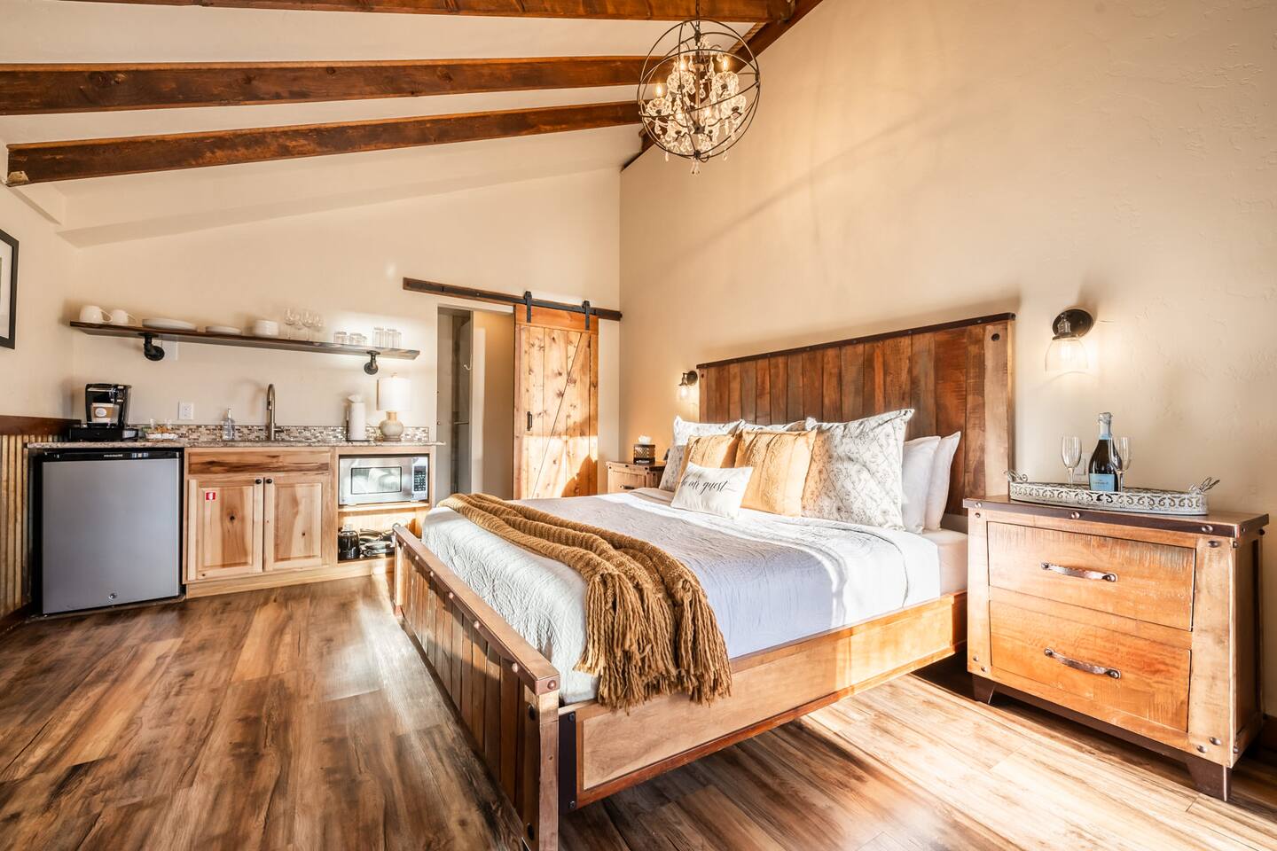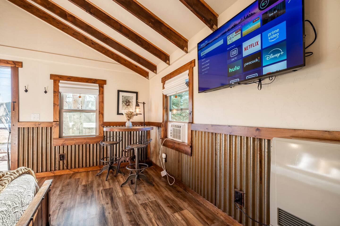 ᨒ༄ King Bed Cabin: Lake + Mtn Views, perfect for a couples retreat! ♥Enjoy the community patio, outdoor stone fireplace, barrel wood sauna, grills, + outdoor dining ♥Unwind in the stone tile bathroom, heated & lighted toilet seat, spacious standup shower ♥Enjoy a fully stocked kitchenette w/ g00gle hub smart display ♥43-inch LG Smart TV: cable, streaming apps like hulu + netflix ♥Indulge in romantic activities such as the spa, hot air balloon rides, casino fun, or a delightful wine tasting!