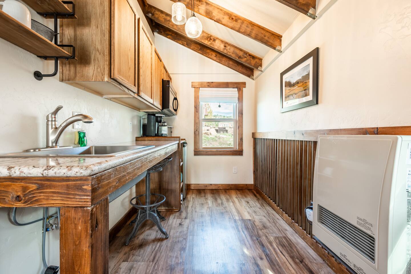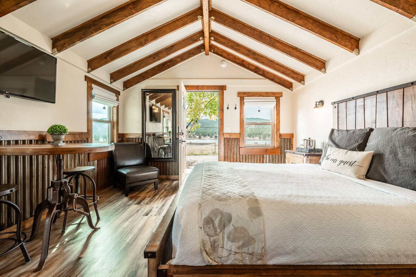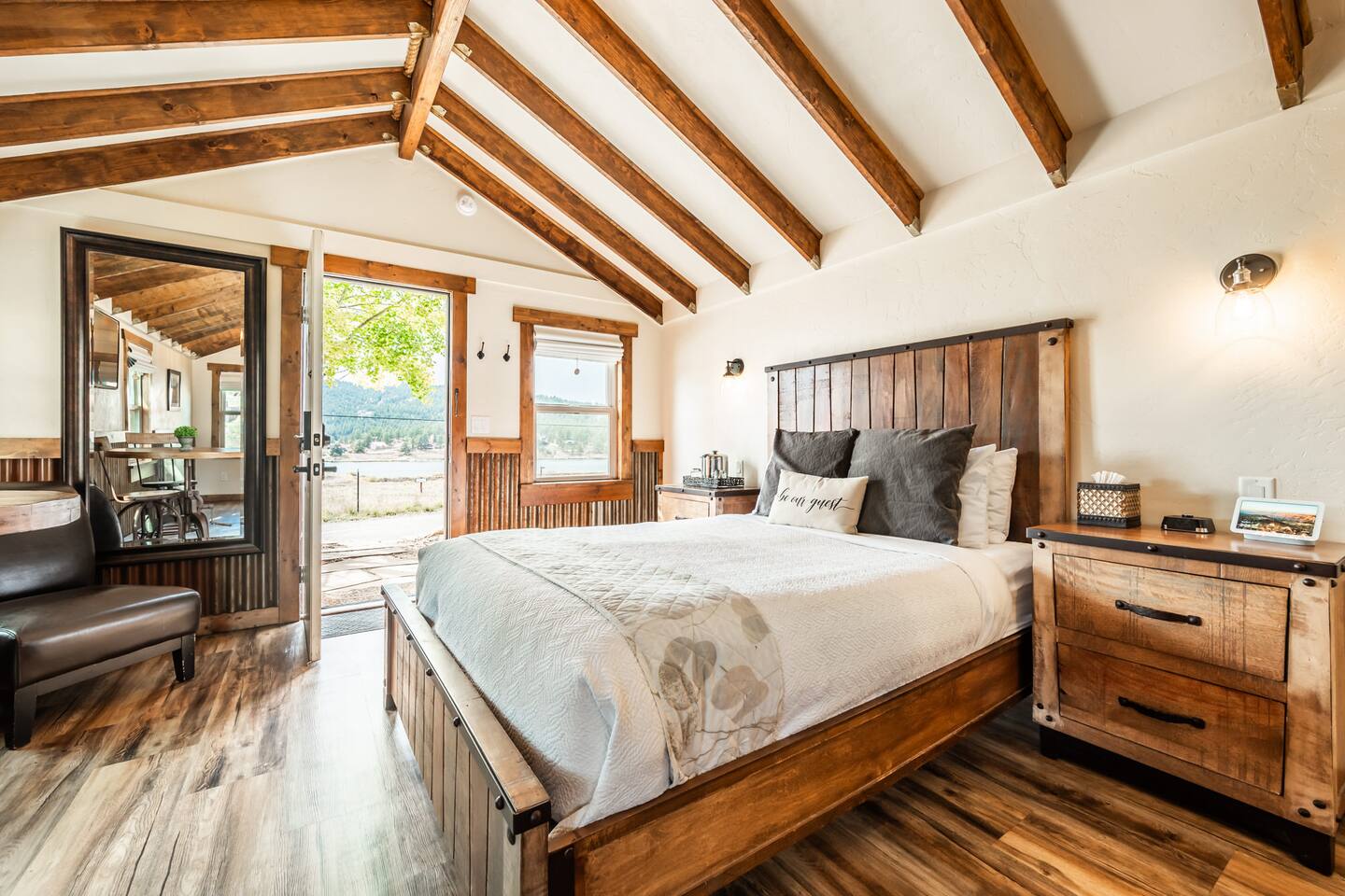Welcome to our cozy cabin in the heart of Lake George, CO! Prepare yourself for a truly rustic chic getaway and soak in the refreshing mountain air. Our collection of five-star cabins awaits you, complete with luxurious amenities. Whether you're planning a trip with a friend or your partner, this cabin is the perfect place to enjoy a getaway for 2. Lake George, CO offers a plethora of outdoor activities for you to explore, along with delightful breweries, pubs, and even a casino to enhance your experience. ✧ Stargaze from the Patio in this Dark Sky Zone ✧ Mountain River Lodge in Lake George, Colorado, is nestled in a designated Dark Sky Zone, making it a premier destination for stargazing enthusiasts. To preserve the breathtaking night skies, all outdoor lighting on the property has been thoughtfully upgraded to Dark Sky Friendly fixtures—including dimmable string lights on the community patio—ensuring minimal light pollution and maximum celestial views. Guests can unwind under the stars from the comfort of the beautifully designed patio, complete with propane fire pits, grills, outdoor dining areas, and a stunning stone wood-burning fireplace. With the patio overlooking Lake George, it’s the perfect setting to enjoy peaceful lake views by day and the brilliance of the Milky Way by night. ✧ Enjoy Local Beer & Eats ✧ Come and discover all the amazing attractions and tours waiting for you in and around beautiful Lake George, CO! Embark on an unforgettable adventure in nearby Colorado Springs as you take part in an exciting 2.5-hour walking tour that'll delight your taste buds with a flight of beer from three incredible craft breweries. If you're feeling lucky, visit the Cripple Creek Casino and try your luck at the gaming tables. And when it's time to indulge your appetite, treat yourself to mouthwatering Colorado-made sausage, Wisconsin cheese, warm pretzels, and delectable salami and cheese platters at BierWerks. Get ready for a truly vibrant and fulfilling experience in Lake George, CO! ✧ Seamless Check-In Experience ✧ But wait, it gets even better - our keyless entry system makes getting into the cabin a total breeze. All you gotta do is enter the special code we gave you and hit that "Lock/Unlock" button on the keypad. You'll hear the door unlocking and just give it a few seconds to fully open before you twist that knob. And when it's time to leave, simply press the "Lock/Unlock" button to secure the place, easy peasy. ✧ Get Comfortable in the Rustic Chic Living Area ✧ Once you step inside, we've thought of everything to make you feel right at home. Start off with a lovely doormat to keep things nice and tidy, and a trusty boot tray in the corner for those wet or dirty shoes. And don't worry about looking your best - we've got a full-length mirror for any last-minute touch-ups. Oh, and storage? We've got you covered. Hang up your coats and jackets on the handy hooks by the door, and make good use of our luggage rack for displaying and unpacking your stuff in a neat and organized way. In the heart of the cabin, a queen-sized bed and a blissful night's sleep await you. Jump in and be surrounded by fresh sheets, luxurious bedding, and an abundance of pillows, guaranteeing you a cozy haven after your exciting adventures. To set the mood, we've added two wall sconces on either side of the bed. Not only do they provide soft lighting for your relaxation, but they also come with easy-to-reach light switches. Right next to the bed, you'll find two side tables with drawers to keep your belongings neatly organized. The table closest to the door has a tray with all the essentials for a refreshing drink – ice bucket, wine opener, and water glasses. On the other side table, we've got you covered with a box of tissues for any unexpected sniffles. Get ready for a stay filled with entertainment! We've got all your viewing needs covered, with a 43-inch LG Smart TV with apps for endless streaming options and DirectTV for live channels. You can find the TV remotes and a channel guide conveniently located in the top drawer of the side table. Now, we should warn you—sometimes our "Rocky Mountain WiFi" can be a little shaky, inviting you to pause and enjoy the serenity of our remote surroundings. We've even thrown in some classic board and card games for whenever you're craving a dose of nostalgic fun! If you need some quiet time, we've got earplugs on hand. Power and charging won't be a problem either, thanks to a digital alarm clock with power outlets and USB ports. We even have spare batteries for the remotes. Convenience is key, so we've tucked away a small trash basket for easy disposal. And when you need to relax, our comfy chair with a cozy throw blanket is waiting for you. Hungry? Head over to our bistro dining table with a stunning view of the lake. And if you need an extra seat, we've got a third stool in the kitchen. Let's talk about keeping you warm – a gas-powered wall heater will do the trick. And if you're feeling too hot, we've got you covered with our window typed AC and a stand-up fan that you can adjust to your liking. Whether you want a gentle breeze or a refreshing blast, this fan has got your back. ✧ Cook in a Kitchen Stocked With All The Essentials ✧ Step right into our efficient and well-equipped kitchen area, designed to make cooking homemade meals simple! First, let's talk about the essentials. Our medium-sized mini-fridge will keep your groceries and beverages perfectly fresh throughout your stay. The space boasts a Cuisinart 2-burner induction cooktop, for meals that are made on the stove. And of course, we know you can't start your day without a cup of your favorite hot beverage, which is why our trusty Keurig coffee maker is here to save the day, along with complimentary powdered creamer, sugar, and sugar-free sweetener. But wait, there's more! Our toaster oven is here to make toasting, baking, and quick meals a breeze, while our over-counter mic