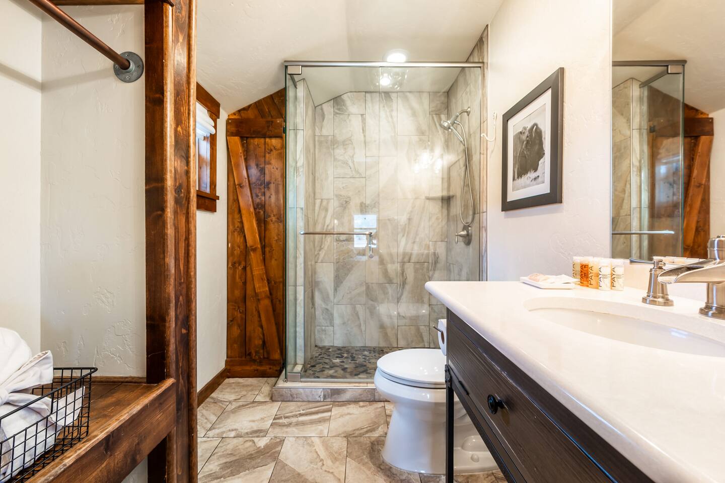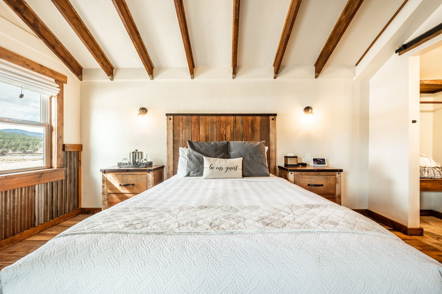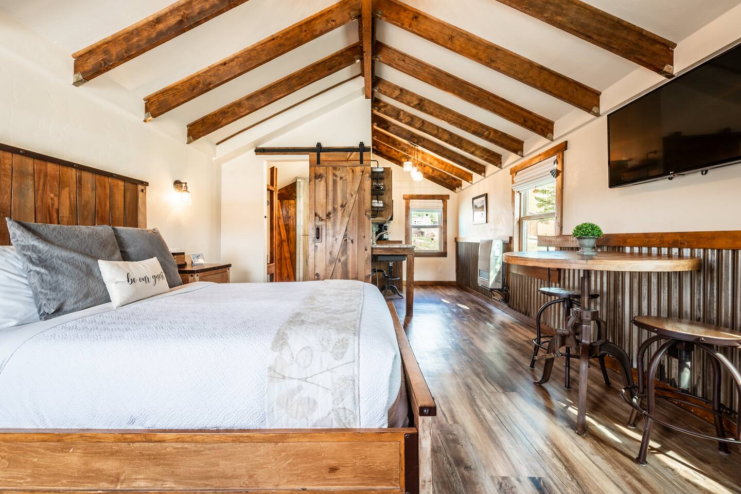 Welcome to our cozy cabin in the heart of Lake George, CO! Prepare yourself for a truly rustic chic getaway and soak in the refreshing mountain air. Our collection of five-star cabins awaits you, complete with luxurious amenities. Whether you're planning a trip with a friend or your partner, this cabin is the perfect place to enjoy a getaway for 2. Lake George, CO offers a plethora of outdoor activities for you to explore, along with delightful breweries, pubs, and even a casino to enhance your experience. ✧ Stargaze from the Patio in this Dark Sky Zone ✧ Mountain River Lodge in Lake George, Colorado, is nestled in a designated Dark Sky Zone, making it a premier destination for stargazing enthusiasts. To preserve the breathtaking night skies, all outdoor lighting on the property has been thoughtfully upgraded to Dark Sky Friendly fixtures—including dimmable string lights on the community patio—ensuring minimal light pollution and maximum celestial views. Guests can unwind under the stars from the comfort of the beautifully designed patio, complete with propane fire pits, grills, outdoor dining areas, and a stunning stone wood-burning fireplace. With the patio overlooking Lake George, it’s the perfect setting to enjoy peaceful lake views by day and the brilliance of the Milky Way by night. ✧ Enjoy Local Beer & Eats ✧ Come and discover all the amazing attractions and tours waiting for you in and around beautiful Lake George, CO! Embark on an unforgettable adventure in nearby Colorado Springs as you take part in an exciting 2.5-hour walking tour that'll delight your taste buds with a flight of beer from three incredible craft breweries. If you're feeling lucky, visit the Cripple Creek Casino and try your luck at the gaming tables. And when it's time to indulge your appetite, treat yourself to mouthwatering Colorado-made sausage, Wisconsin cheese, warm pretzels, and delectable salami and cheese platters at BierWerks. Get ready for a truly vibrant and fulfilling experience in Lake George, CO! ✧ Seamless Check-In Experience ✧ But wait, it gets even better - our keyless entry system makes getting into the cabin a total breeze. All you gotta do is enter the special code we gave you and hit that "Lock/Unlock" button on the keypad. You'll hear the door unlocking and just give it a few seconds to fully open before you twist that knob. And when it's time to leave, simply press the "Lock/Unlock" button to secure the place, easy peasy. ✧ Get Comfortable in the Rustic Chic Living Area ✧ Once you step inside, we've thought of everything to make you feel right at home. Start off with a lovely doormat to keep things nice and tidy, and a trusty boot tray in the corner for those wet or dirty shoes. And don't worry about looking your best - we've got a full-length mirror for any last-minute touch-ups. Oh, and storage? We've got you covered. Hang up your coats and jackets on the handy hooks by the door, and make good use of our luggage rack for displaying and unpacking your stuff in a neat and organized way. In the heart of the cabin, a queen-sized bed and a blissful night's sleep await you. Jump in and be surrounded by fresh sheets, luxurious bedding, and an abundance of pillows, guaranteeing you a cozy haven after your exciting adventures. To set the mood, we've added two wall sconces on either side of the bed. Not only do they provide soft lighting for your relaxation, but they also come with easy-to-reach light switches. Right next to the bed, you'll find two side tables with drawers to keep your belongings neatly organized. The table closest to the door has a tray with all the essentials for a refreshing drink – ice bucket, wine opener, and water glasses. On the other side table, we've got you covered with a box of tissues for any unexpected sniffles. Get ready for a stay filled with entertainment! We've got all your viewing needs covered, with a 43-inch LG Smart TV with apps for endless streaming options and DirectTV for live channels. You can find the TV remotes and a channel guide conveniently located in the top drawer of the side table. Now, we should warn you—sometimes our "Rocky Mountain WiFi" can be a little shaky, inviting you to pause and enjoy the serenity of our remote surroundings. We've even thrown in some classic board and card games for whenever you're craving a dose of nostalgic fun! If you need some quiet time, we've got earplugs on hand. Power and charging won't be a problem either, thanks to a digital alarm clock with power outlets and USB ports. We even have spare batteries for the remotes. Convenience is key, so we've tucked away a small trash basket for easy disposal. And when you need to relax, our comfy chair with a cozy throw blanket is waiting for you. Hungry? Head over to our bistro dining table with a stunning view of the lake. And if you need an extra seat, we've got a third stool in the kitchen. Let's talk about keeping you warm – a gas-powered wall heater will do the trick. And if you're feeling too hot, we've got you covered with our window typed AC and a stand-up fan that you can adjust to your liking. Whether you want a gentle breeze or a refreshing blast, this fan has got your back. ✧ Cook in a Kitchen Stocked With All The Essentials ✧ Step right into our efficient and well-equipped kitchen area, designed to make cooking homemade meals simple! First, let's talk about the essentials. Our medium-sized mini-fridge will keep your groceries and beverages perfectly fresh throughout your stay. The space boasts a Cuisinart 2-burner induction cooktop, for meals that are made on the stove. And of course, we know you can't start your day without a cup of your favorite hot beverage, which is why our trusty Keurig coffee maker is here to save the day, along with complimentary powdered creamer, sugar, and sugar-free sweetener. But wait, there's more! Our toaster oven is here to make toasting, baking, and quick meals a breeze, while our over-counter mic
