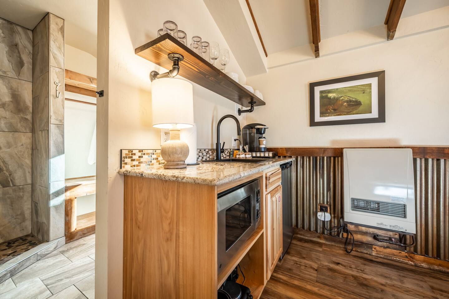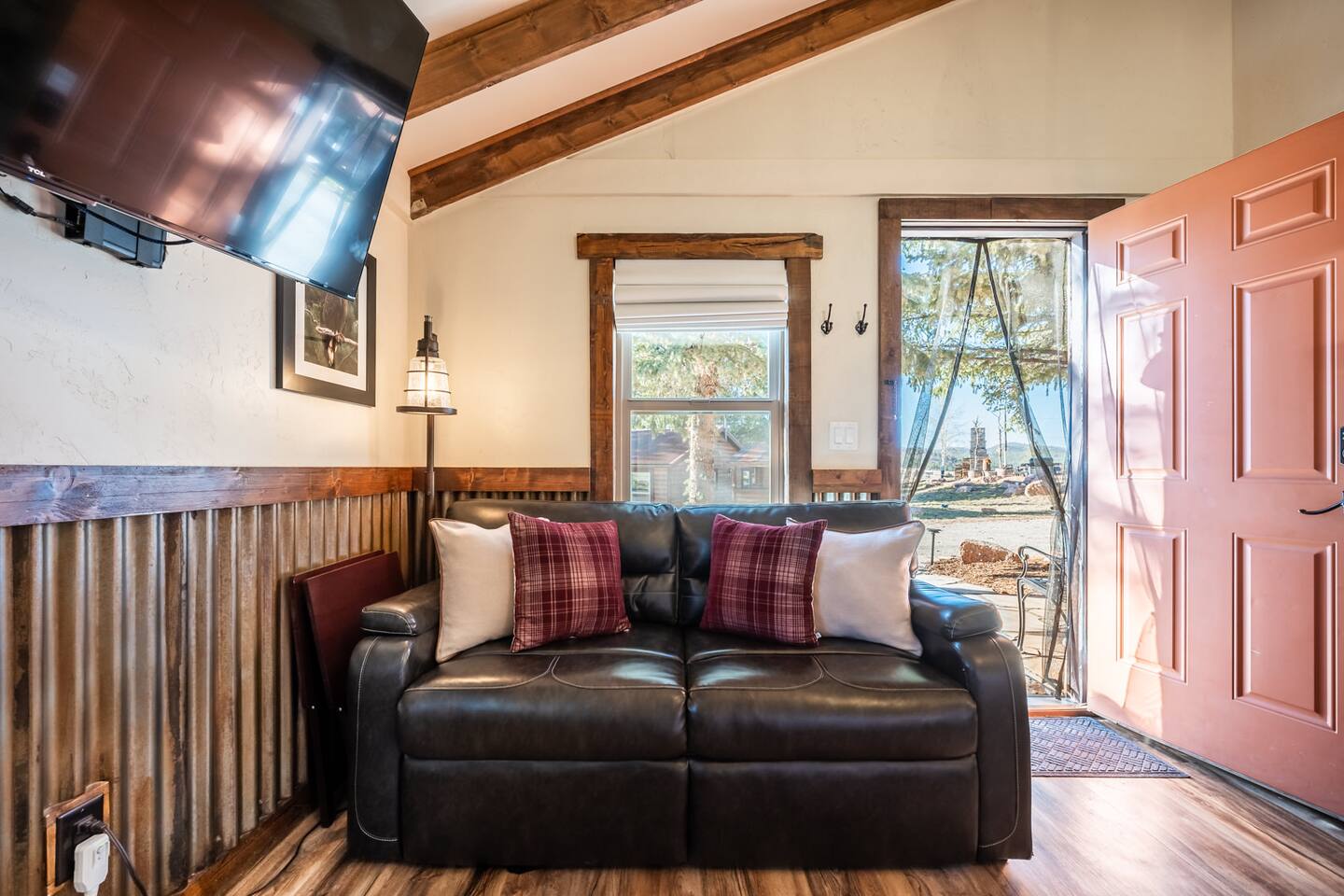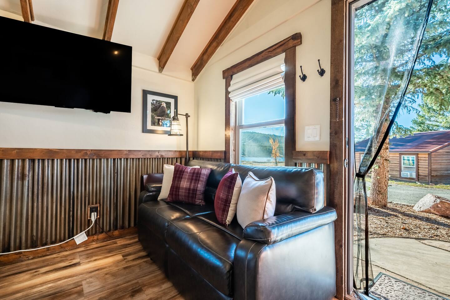 Welcome to Mountain River Lodge & Cabins, where you can experience the breathtaking beauty of the Colorado Rocky Mountains. Surround yourself with untouched nature and be captivated by the refreshing mountain breeze. If you're an adventure enthusiast, you'll love our conveniently located lodge nestled amidst thrilling experiences just waiting to be conquered! Our cabins exude rustic elegance, with stunning decor, modern amenities, and updated furnishings, ensuring a five-star mountain getaway. Get ready to embark on unforgettable adventures! ◈ Hike & Bike with Epic Views ◈ Embrace the thrill of high-altitude hiking expeditions or experience the rush of speeding down exhilarating mountain bike trails. Feel the serenity as you trek through picturesque alpine meadows or enjoy a relaxing ride along the scenic Colorado River bed. The choice is yours, and it's all right here! Looking to conquer a "fourteener"? Look no further than nearby Mueller State Park and Lost Creek Wilderness where you'll find plenty of majestic mountains towering over 10,000 feet in elevation as well as our favorite 14er, Pikes Peak. It's a must-do for any adventurer with a bucket list! But that's not all - we also have a variety of top-notch trails to explore, catering to all levels of experience. From the The famous Crags trail, to Pancake Rocks to the Dome Rock Trail, there's something for everyone. And if mountain biking is your passion, you're in luck! Our lodge is surrounded by incredible biking trails, including the Midland Trail and a ten-mile loop through the stunning northern area of Mueller State Park. Whether you're a seasoned hiker or a beginner looking for family-friendly trails, we have it all! ◈ Unlock Your Home Away From Home ◈ Bid farewell to key hassles and restrictive check-in times. Our keyless entry system ensures a hassle-free arrival—simply input the provided code, and your mountain sanctuary awaits. The inviting front porch beckons with a wrought-iron bench, offering a perfect spot to savor the crisp mountain air. Convenient fisherman's wader hooks nearby cater to your gear after a day exploring the nearby award-winning fishing spots. ◈ Comfort Unleashed in the Living Area ◈ Relax on a sumptuous leather sofa and delve into entertainment with a 43-inch LG Smart TV, offering a spectrum of streaming options. For aficionados of live channels, Direct TV awaits. Now, we should warn you—sometimes our "Rocky Mountain WiFi" can be a little shaky, inviting you to pause and enjoy the serenity of our remote surroundings. We've even thrown in some classic board and card games for whenever you're craving a dose of nostalgic fun! We've also upgraded this cabin to Starlink wifi, to reduce interruptions in your entertainment. For groups of 3 or 4, the sofa transforms into a queen-size bed without compromising comfort. Fresh sheets, bedding, and pillows discreetly tucked inside ensure a regal slumber. Illuminate your space with a stylish floor lamp in the corner, and let the wonderful gas-powered wall heater keep you toasty. A window-AC and a stand-up fan awaits for those sunny days, providing a customizable breeze according to your preferences. ◈ Sleep Like a Baby ◈ The heart of your cabin, the cozy queen-sized bed, awaits. Immerse yourself in luxury with fresh sheets, plush bedding, and an abundance of fluffy pillows. Stylish wall sconces set the perfect mood for unwinding after a day of adventures. Two side tables with drawers stand ready to cradle your personal belongings. Expect the unexpected with tissues on one side table and a digital alarm clock with power outlets and USB ports for device charging. TV enthusiasts are catered to with remotes, a channel guide, and spare batteries. Enjoy complimentary earplugs for moments of serenity. A small trash basket in the corner and a handy luggage rack maintain order. ◈ Efficient Kitchenette for Culinary Delights ◈ Embark on a culinary adventure in our thoughtfully designed kitchenette. You will find everything you need to cook a meal. Hot plates, pots and pans, a strainer, knives, measuring utensils, a blender and even a waffle maker! A medium-sized mini-fridge eagerly awaits your perishables and beverages. Stock it with your favorite snacks for a refreshing stay. A microwave stands ready for your heating and reheating needs. As a sweet surprise, enjoy complimentary handmade s'mores kits for fireside indulgence. Our Keurig coffee maker, complete with a curated tray of essentials, guarantees a delightful start or end to your day. A G00gle Hub smart display on the bedside table provides the power of convenience at your fingertips. Numerous commands are at your disposal to play music, produce a variety of "white noise" or sleep sounds, set alarms, or ask questions about the local area and weather forecast. For your convenience, there's a table lamp on the counter, ready to provide extra lighting when needed. Need to clean up? No problem! We've got you covered with a handy kitchen towel for any spills or messes. And for your safety, we also have a fire extinguisher conveniently placed under the sink, just in case. ◈ Freshen Up Like Royalty in the Bathroom ◈ Step into our charming bathroom, where rustic ambiance meets modern convenience. The sliding barn-style door opens to a vanity featuring a pump-style faucet and a generously lit, spacious mirror. Abundant counter space ensures an effortless grooming routine. The spa-like stand-up shower with a luxurious tile surround offers an invigorating experience, complete with a removable showerhead wand for customized comfort. Expect nothing but the best in bathroom essentials: fresh towels, shampoo, conditioner, body gel, and even two luxurious robes and complimentary slippers for the ultimate in comfort. A wood bench area with ample hangers, a fabric steamer, a hair dryer, and additional amenities cater to your every need. The heated and lighted toilet seat adds a touch of luxury! ◈ Private Back