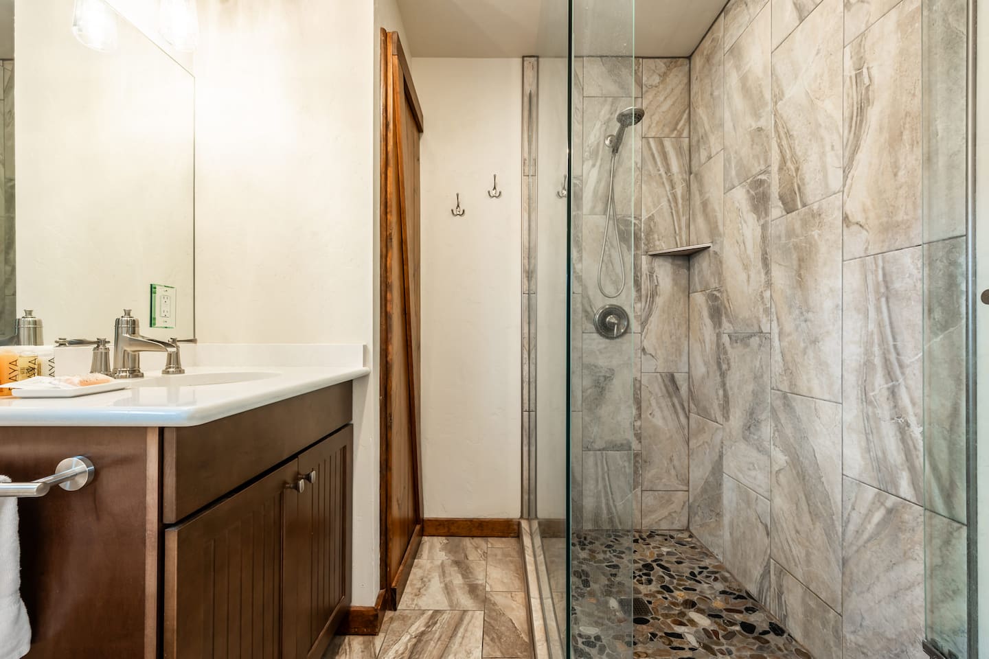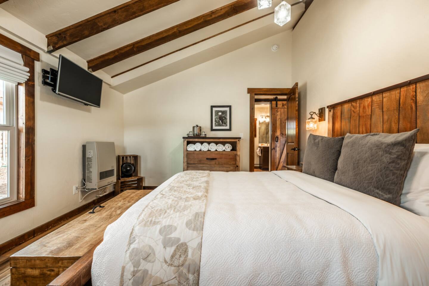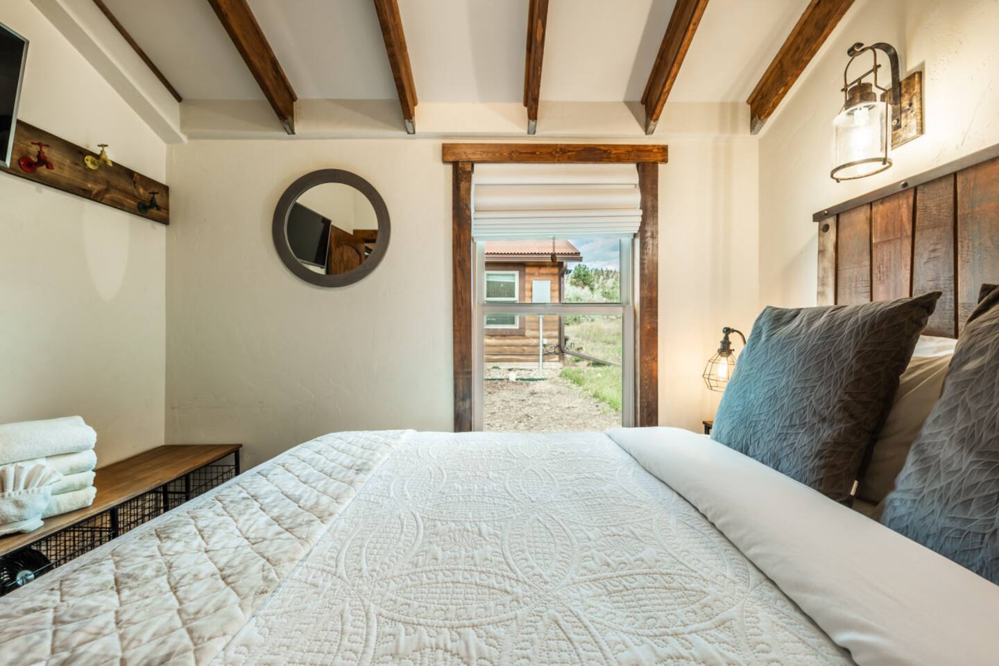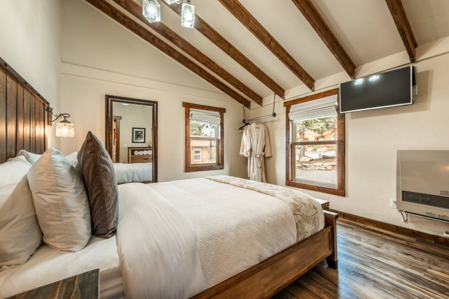 You will have exclusive access and private use of the full interior of your cabin. This cabin offers a rare feature that sets it apart from some of the other cabins—your very own private backyard with barrel wood sauna. Unlike the shared community patio available to all guests, this secluded outdoor space is reserved exclusively for your cabin. Outfitted with barrel wood sauna, Adirondack chairs and a modern gas fire pit, the backyard is the perfect spot for cozy conversations, roasting marshmallows, or stargazing in the crisp mountain air. All guests at Mountain River Lodge have exclusive access to a fully stocked Community Game Hub, located just steps from the cabins. Inside, you'll find everything from cornhole, giant Connect 4, ladder toss, and pickleball paddles, to basketballs, footballs, tennis rackets, and more. The space is designed with play in mind—whether you're planning a full day of games with family or just want to grab some gear and head outside, it's all here for you. And if you're looking to break a sweat or challenge a friend to a match, there are tennis courts conveniently located right across the street from the property. Bring your rackets (or borrow ours) and enjoy a match with stunning mountain views as your backdrop. Also, enjoy shared access to the central brick patio and amenities including wood-burning fireplace, outdoor lounge and dining furniture, two propane fire pits, two commercial grills, and barrel wood sauna. Guests from all cabins are welcome to use this space, so please ensure your behavior and noise volume is appropriate and considerate of others, especially during quiet hours of 10pm to 8am. You will have one dedicated parking space directly next to your cabin. A dirt parking lot at the west end of the property can be used for additional or oversized vehicles, RVs, boats/trailers, ATVs, as well as any vehicles with a tendency or potential to leak automotive fluids. Please park wisely and be considerate of others sharing this space.